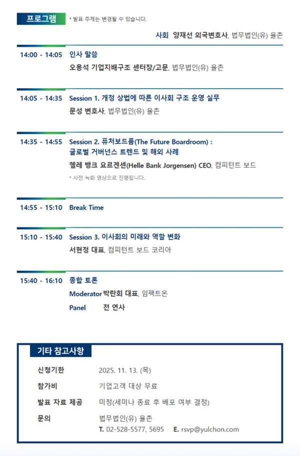 세미나 참석자 100명에게는 선착순으로 『퓨처 보드룸』 신간이 제공된다. 신청은 11월 13일까지 율촌 홈페이지 또는 카카오톡 채널을 통해 가능하며, 참가비는 무료다.
