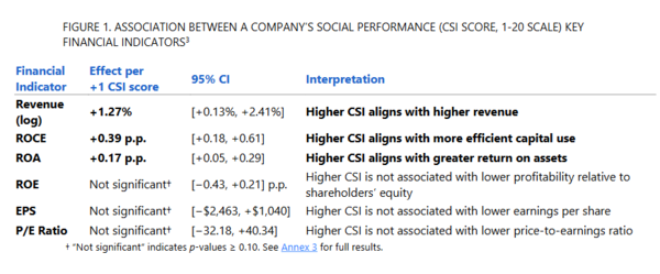 WBA는 인권, 근로환경, 윤리경영 등을 평가하는 18개 핵심 사회지표(Core Social Indicators, CSI)를 기준으로 기업들을 0~20점으로 평가했다. 기업 규모와 지역, 부채비율 등을 통제한 결과 CSI 점수가 1점 오를 때마다 매출은 1.27% 증가했고, 투하자본수익률(ROCE)은 0.39%포인트, 총자산순이익률(ROA)은 0.17%포인트 각각 상승했다. 사회적 책임 경영 역량이 높을수록 영업 효율성과 재무 건전성이 개선되는 경향이 확인된 것이다.