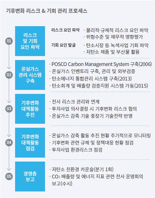 경영진은 ‘포스코그룹 환경‧에너지 통합경영 방침’을 수립해 중장기 사업 전략과 투자 결정 시 환경에 미치는 영향을 의무적으로 검토한다. 투자관리 규정에 온실가스 배출 등 환경 리스크가 예상되는 사업은 전문부서와 협의 과정을 거치도록 명시하고, 투자 검토 시 탄소 비용을 반영하는 등 환경 리스크를 고려한다. 또한 ESG 전담 조직을 운영, 직원들에게 UN SDGs의 의미와 내용, TCFD와 회사 가치의 관계를 안내하는 활동도 하고 있다.