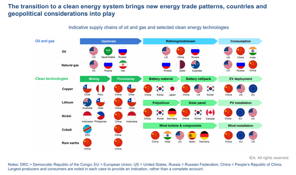 가장 중요한 것은 석유의 경우 전 세계에서 생산되고 거래되는 반면, 리튬, 코발트, 희토류 등의 핵심 광물 생산과 가공은 소수 국가에 고도로 집중돼있으며, 상위 3개국 생산자가 공급량의 75%를 차지하는 것으로 드러났다. 석유자원의 경우 미국이 주요한 채굴과 생산국가였지만, 광물자원의 경우 중국이 핵심 역할을 차지했다.