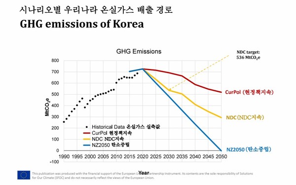 연구 결과에 따르면, 현 정책을 지속할 경우 2030년까지 10% 감축도 어려울 것으로 나타났다. 2050년까지는 단 30%만 감축했다. UN에 제출한 NDC 경로를 지켜 2030년 24.4% 감축에 성공했을 경우에도 2050년엔 60% 감축만 가능할 것으로 예상된다. 두 경로 모두 2050년 탄소중립을 달성하기엔 턱없이 부족한 계획인 것이다.