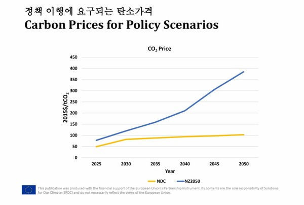 정책 이행에 요구되는 탄소 가격도 상승할 것으로 예측된다. NDC 경로를 상정했을 때, 2030년엔 톤당 80달러, 2050년엔 톤당 100달러 정도로 낮은 가격이 예측되는 반면, 2050년 탄소중립을 상정했을 땐 2030년 120달러, 2050년 390달러로 예측됐다. NDC 경로를 따랐을 경우 2050년 넷제로 시나리오보다 탄소 가격은 저렴히 책정됐지만, 탄소국경세 등 탄소 감축을 하지 못해 부과되는 비용이 계산된다면 지불해야 될 비용은 더 많아질 것으로 예상된다. 카이스트 엄지용 교수는 “2배 내지 3배 정도로 탄소 가격을 상승해 탄소 감축의 중요성을 일깨울 필요성도 있다”고 평했다.