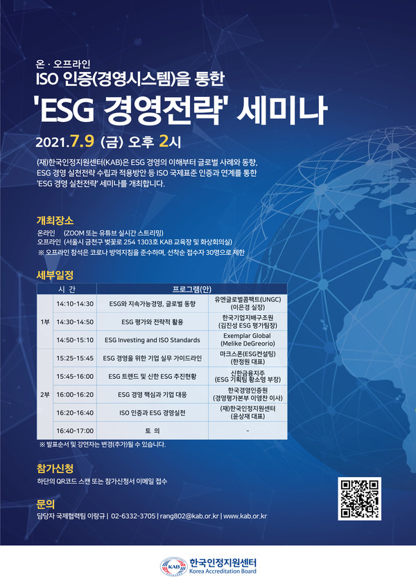 한국인정지원센터가 9일 오후 2시에 'ISO 국제표준 인증과 연계를 통한 ESG 경영 실천전략' 세미나를 개최한다.
