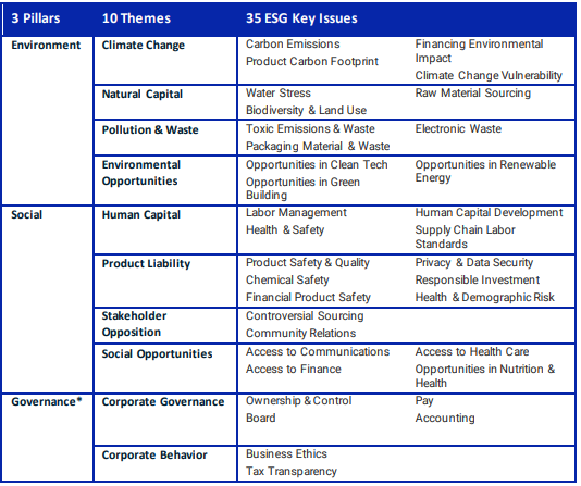 MSCI는 ESG 각 분야의 주요 이슈 35가지를 선정하고, 다시 각 산업별로 35가지 이슈중 중요 이슈를 추려내어 이를 중심으로 ESG리스크 및 기회 평가를 진행한다(거버넌스 분야의 이슈는 모든 산업에 포함된다).