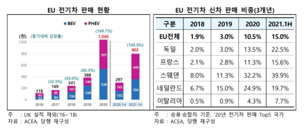 곽병근 연구원은 “EU 신차 판매 중 전기차 판매 비중이 20년 10%를 초과하고, 21년 상반기 15%를 기록하는 등 전기차 전환 속도가 빠르게 진행되고 있다”고 전망했다.