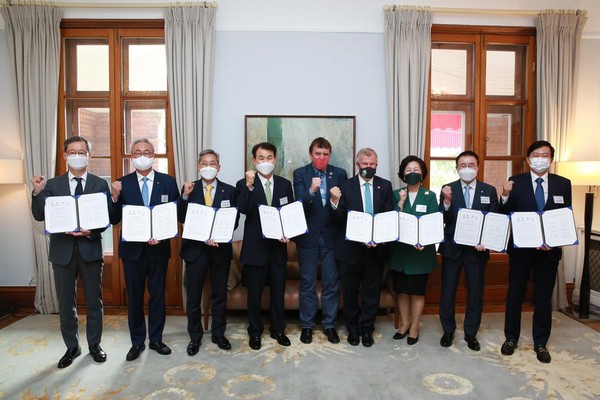 업무협약 체결식에는 정은보 금감원장과 사이먼 스미스 주한 영국대사, 그리고 협약에 참여하는 김은미 이화여대 총장, 김준 SK이노베이션 총괄사장, CJ제일제당 최은석 대표, 존림 삼성바이오로직스 대표, 윤종규 KB금융지주 회장, 조용병 신한금융지주 회장 등이 함께 했다.