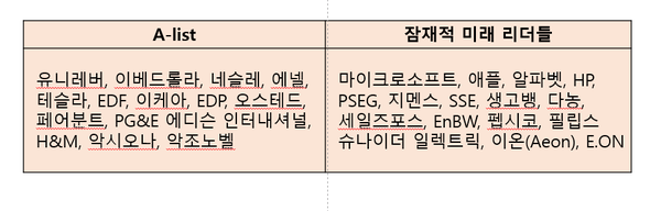 에디슨 인터내셔널, EDF, H&M은 2018년 잠재적 미래 리더에 속해 있었는데, 이번 조사로 A-list에 들었다.