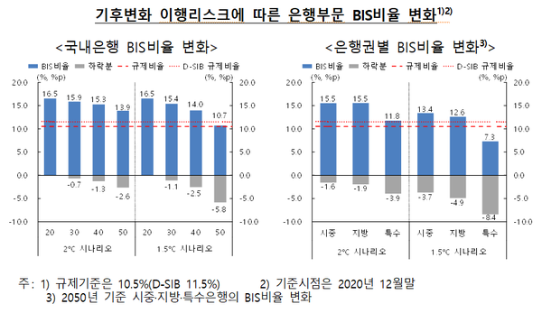 탄소중립 친환경 경제로의 전환 과정은 금융 시스템에도 적잖은 영향을 미칠 것으로 예상된다. 한은이 보고서를 통해 공개한 국내 은행의 자기자본비율(BIS 비율)의 경우, 2℃ 시나리오에서는 2050년경에 올해 대비 최대 2.6%p 하락했고, 1.5℃ 시나리오에서는 2050년경에 올해 대비 최대 5.8%p 떨어졌다. 한은은 기후변화로 인한 피해가 현실화된다면, 기업의 금융자산 가치가 하락해 같은 자산을 보유한 금융기관의 건전성도 악화할 것이라고 분석했다.