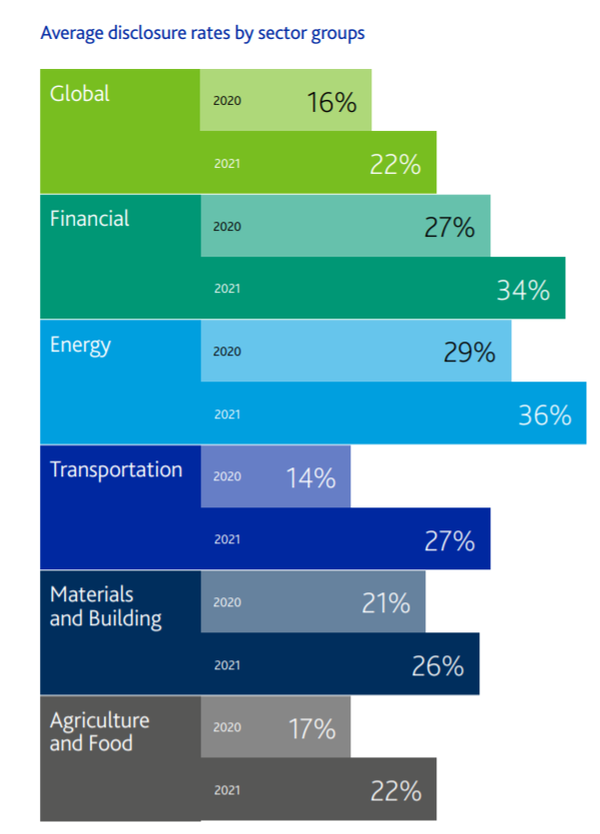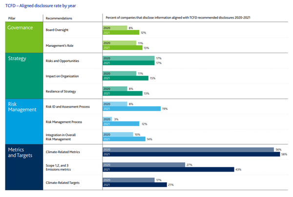 하지만 2020년 16%였던 TCFD(기후관련 재무정보공개 태스크포스) 공시가 2021년 22%로 높아져 기후 공시 비율은 점점 높아지고 있었다. 이중 13%만이 TCFD가 권고한 기후변화로 인한 비즈니스 영향을 이해하기 위해 시나리오 분석을 시행했다고 공시했다.