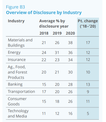 지난달 TCFD가 발표한 보고서에 따르면, 올해 기후와 관련된 위험과 기회를 어떤 형태로든 공개하는 기업은 절반에 불과하며 평균 공개 수준은 11개 권고안의 3분의 1 정도에 불과했다고 밝혔다. 전 세계 1600개 이상의 기업을 대상으로 했다.