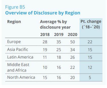 국가별로는 유럽의 기업이 압도적으로 많은 정보를 공개했다. 아시아-태평양 지역과 라틴 아메리카가 뒤를 이었다. 반면 ESG 정보공개 규정을 독자적으로 개발하고 있는 미국을 포함한 북아메리카에서는 공시율이 20%에 머물렀다.