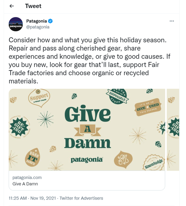 2011년 ‘이 재킷을 사지 마세요(Don’t buy this jacket)’라는 ‘안티 블랙 프라이데이’ 광고로 유명한 아웃도어 브랜드 파타고니아는 몇 년째 블랙 프라이데이에 맞선 캠페인을 벌인다. 올해 파타고니아의 캠페인은 ‘관심을 가져라(Give A Damn)’다. ‘빌어먹을(damn)’이라는 욕설과 ‘give a damn(관심을 가져)’라는 중의어를 이용한 메시지형 캠페인을 벌이는 것이다.