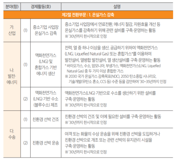 K-택소노미 최종안에는 5월 공개된 초안과는 달리 전환부문이 신설됐다. 녹색경제활동으로 볼 순 없지만 탄소중립으로의 전환을 위한 과도기적 성격의 경제활동이다. ▲중소기업의 온실가스 감축 활동 ▲LNG 및 혼합가스 기반 에너지 생산 ▲블루수소 제조 ▲친환경 선박 건조 ▲친환경 선박 운송 등이 여기에 포함됐다.
