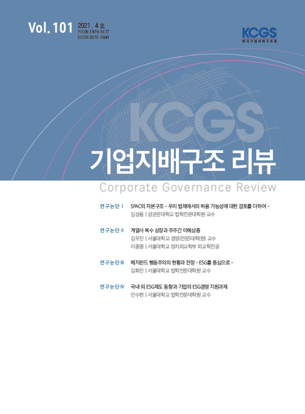 또한 “행동주의 헤지펀드나 기타 적대 세력은 회사의 ESG 관련 대응이 부실할 경우, 회사에 대한 공격에 경영 실적보다는 ESG 이슈를 전면에 내세울 가능성이 높다”면서 “ESG 이념과 함께 기업 지배구조와 회사법에 미치는 영향에 대한 연구가 향후 회사법과 자본시장법 학계의 큰 과제가 될 것”이라고 덧붙였다.