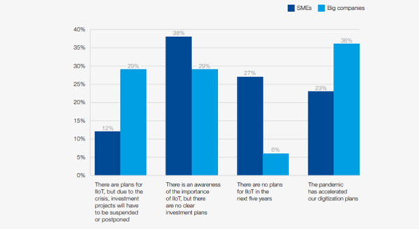 하지만 디지털 기술 투자 계획에 있어, 중소기업은 대기업보다 뒤쳐져 있는 것으로 나타났다. 대기업의 29%는 IIoT(산업 사물인터넷)의 중요성은 인식하고 있지만 투자계획은 없다고 답한 반면, 중소기업 응답율은 38%에 달했다. 또 대기업의 6% 가량이 향후 5년내에 IIoT 투자 계획이 없다고 답했지만, 중소기업은 27%가 그렇다고 답했다.