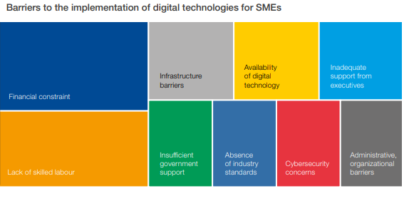 이에 따라 보고서는 중소기업이 디지털 기술을 도입하지 못하는 원인도 조사했다. 중소기업은 가장 큰 장벽으로 재정 부족을 꼽았으며 그 다음으로 디지털 기술을 활용할 수 있는 숙련된 직원이 없다는 것을 꼽았다. 그 밖에 공공기반시설 부족과 기술의 낮은 가용성, 임원진의 부적절한 지원 등이 장벽으로 제시됐다.