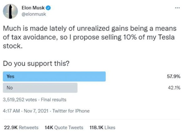 지난해 11월, 머스크는 트위터에 “최근 들어 미실현 이익이 조세회피 수단이 되고 있다는 것과 관련해 많은 논의가 있었다. 이에 내 테슬라 주식 10%를 매각하는 방안을 제안한다”는 글과 함께 자신의 주식 매각을 지지하는지 묻는 설문을 올렸다. 트위터 게재 후 테슬라 주가는 7% 정도 떨어졌다.