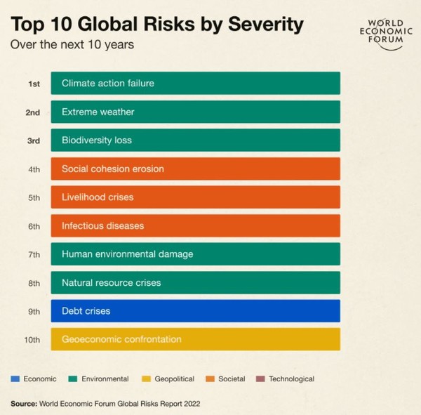 응답자들은 향후 10년동안 세계가 직면할 가장 큰 리스크로 ‘기후 행동 실패’를 꼽았다. 그 다음으로 높게 제시된 리스크로 ▲극단적인 기상 현상 ▲생물다양성 손실 ▲사회적 응집력 약화▲생계 위기 ▲전염병 ▲인간 환경 훼손 ▲천연자원 위기 ▲채무 위기 ▲지경학적 대립(Geoeconomic confrontation) 등이 순서대로 꼽혔다. 특히, 기후변화와 생물다양성 등이 상위 리스크로 연달아 꼽혀, 환경적 측면이 국제사회가 직면한 가장 큰 위협이자 도전과제라는 사실이 나타났다.