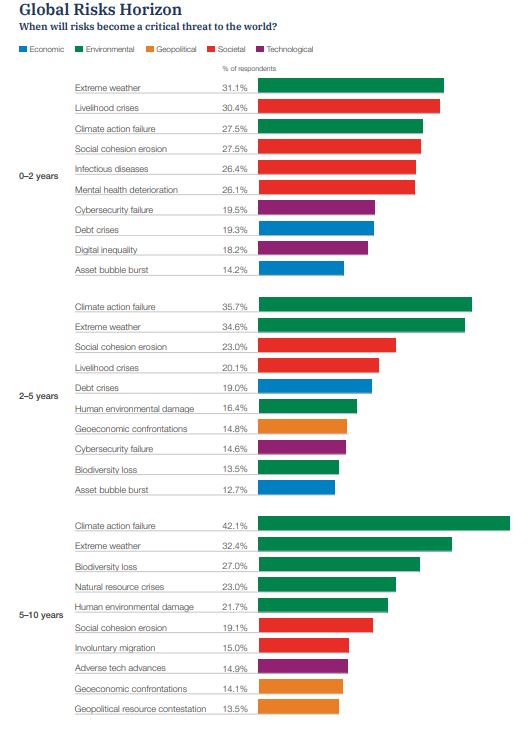 더 나아가, WEF는 단기(0-2년), 중기(2-5년), 장기(5-10년)적으로 직면할 수 있는 글로벌 리스크를 조사했다. 향후 2년동안 국제사회가 직면할 리스크로 극단적인 기상 현상(31.3%)과 생계위기(30.4%), 기후 행동 실패(27.5%), 사회적 응집력 약화(27.5%)가 상위에 랭크됐다. 그러나 장기적으로 보았을 때, 환경 이슈에 대한 리스크의 우려가 가장 높았다. 응답자들의 42.1%는 향후 10년동안 글로벌 최대 리스크는 기후 행동 실패로 보았으며, 그 다음으로 32.4%는 극단적인 기상 현상, 27%는 생물다양성 손실, 23%는 천연자원 위기로 나타났다.