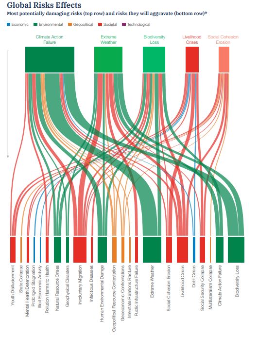가장 큰 리스크로 여기고 있는 기후 행동 실패는 극단적인 기상 현상, 생물다양성 손실 등 환경적 요소 뿐만 아니라 생계위기, 사회적 응집력 약화, 비자발적인 이주 등 사회적 요소와 더불어 지정학적 자원 대립, 장기 경기 침체 등 정치 경제적 영역까지 광범위하게 악영향을 미칠 수 있다고 생각하는 것으로 나타났다. 응답자들은 기후 행동 실패가 전 영역에 악영향을 미칠 수 있기에 세계가 직면한 가장 큰 위기로 인식하고 있는 것이다.