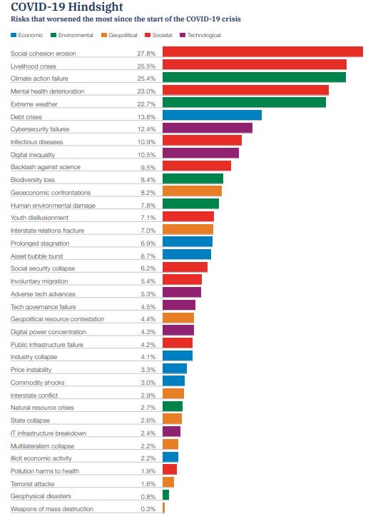 또, WEF는 코로나19로 인해 가장 악화된 리스크를 조사했는데, 가장 높게 꼽힌 리스크는 ▲사회적 응집력 약화 ▲생계 위기 ▲정신건강 악화로 나타났다. 코로나19에 따른 사회적 거리두기와 백신 불평등, 경제 악화로 응답자들은 사회적 측면의 리스크가 가중되었다고 보았다. WEF는 이러한 사회적 리스크가 효과적인 국가 정책 수립의 약화시키고, 국제적 협력에 필요한 집중에 장애가 될 수 있다고 분석했다.