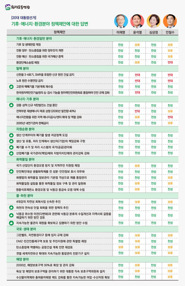 환경운동연합의 조사 결과 이재명·윤석열·심상정·안철수 후보는 강릉과 삼척의 신규 석탄발전소 건설 중단과 고준위 핵폐기물 기본계획 재수립에 모두 뜻을 모았다. 폐기물 등 자원순환 분야에선 모든 후보가 관련 정책을 시행하겠다고 밝혔다.
