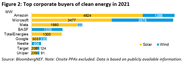 2021년 전세계 전략구매계약(PPA)을 분석한 결과 지난 한해동안 글로벌 기업들은 31.1기가와트의 구매 계약을 체결했는데, 이는 2020년 사상최대 규모였던 25.1기가와트 구매보다 24%로 증가한 것으로 기록을 갈아치웠다. 1기가와트는 약 30만 가구가 한 해에 사용할 수 있는 전기량이다. 이중 20.3기가와트가 미국 내에서 사업활동을 펼치는 기업들이 계약한 것으로 전체 구매 규모의 65%를 차지했다. 그 중에서 가장 큰 구매자는 IT 기술기업인 것으로 나타났다.