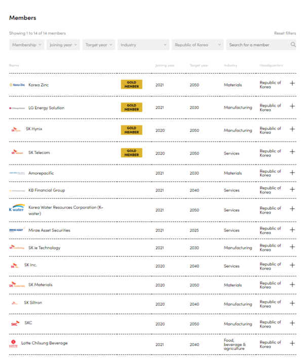총 53개 기업이 가입했다. 그중 한국 기업은 14개며, 39개는 HP코리아, 애플코리아, 샤넬 코리아와 같은 외국계 기업의 한국지사다. 2022년 현재 RE100에 가입서를 내고 승인까지 마친 곳은 ▲고려아연 ▲LG에너지솔루션 ▲SK(주) ▲SK하이닉스 ▲SK텔레콤 ▲SK테크놀로지 ▲SK주식회사 ▲SK머티리얼즈 ▲SK실트론 ▲아모레퍼시픽 ▲KB금융그룹 ▲한국수자원공사 ▲미래에셋 ▲롯데칠성음료다. 현대차, 기아, 현대모비스, 현대위아, 현대트랜시스는 가입선언 후 승인대기 상태에 있다.