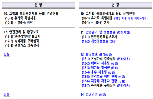 한편 자율 공시로 운영 중인 유가족 특별채용, 이사회 회의록 외 기타자료, 경영혁신사례 항목은 공시에서 제외됐다. 통합공시 항목에 대한 가독성을 높이기 위해 ▲안전관리 및 정보보호 ▲환경보호 ▲사회공헌활동 ▲인권경영 ▲이사회 회의록 ▲일·가정 양립 지원제도 등을 합친 ESG 경영 항목을 신설했다.