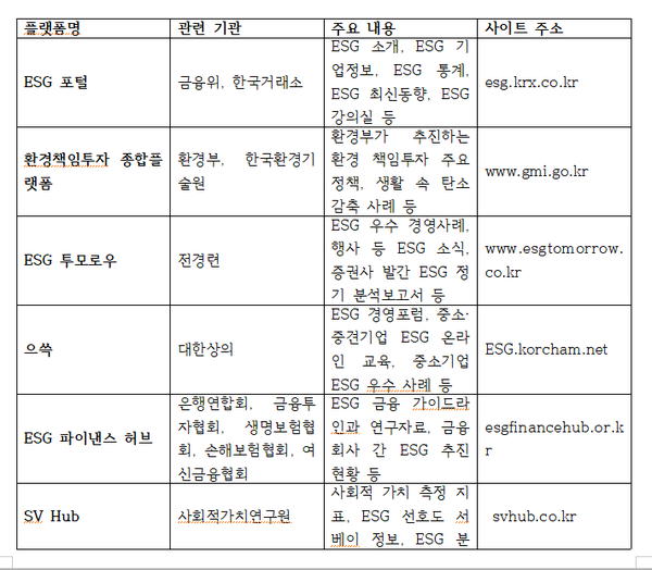 ESG 포털, 환경책임투자 종합플랫폼, ESG 투모로우, 으쓱 등