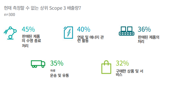 응답자의 31%만이 "스코프 3 탄소 배출량을 공개할 준비가 됐다"고 응답했다. 응답자의 45%는 "판매된 제품이 사용 이후 처리될 때 배출하는 탄소 집계가 어렵다"고 밝혔고, 40%는 스코프 1·2를 벗어난 연료 및 에너지 사용을 추적하는데 어려움을 겪었다. 36%는 판매 제품 가공 단계에서 어려움을 겪고 있는 것으로 나타났다.