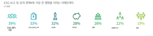 ESG 정보 공개에 영향을 미치는 가장 큰 주체로는 39%가 ESG 평가 기관을 꼽았다. 33%는 고객·소비자를, 32%는 이사회를 꼽았다. 투자자, 정부, 비정부 기구도 영향을 미치는 것으로 나타났다.