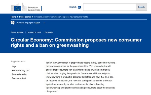 유럽 집행위원회(EC)는 친환경적인 소비를 촉진하고 제품의 그린워싱을 억제하기 위한 유럽연합(EU) 소비자 보호법(EU consumer rules) 일부 개정안을 그린딜 패키지에 묶어 30일(현지시간) 발의했다.