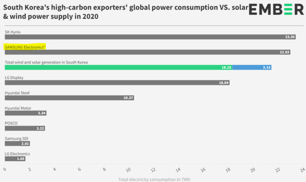 국내에서는 풍력 및 태양광을 설치할 토지가 부족하기 때문에 재생에너지 업자들이 더 비싼 기술을 사용해야 한다는 문제도 있다. 기후 싱크탱크 엠버(Ember)에 따르면 재생에너지 보급률은 높지 않은 반면 2020년 기준 삼성전자의 전기 사용량은 국내 전체 태양광과 풍력 발전 용량보다 20% 더 많은 에너지를 사용한 것으로 나타났다.
