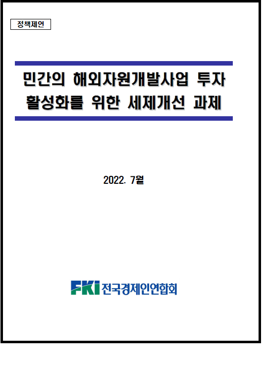 하나는, 민간의 해외자원개발 투자를 활성화하려면 투자・수익실현・손실보전 단계별로 세제 지원을 강화해야 한다는 주장이다. 전국경제인연합회(이하 ‘전경련’)는 13일, 이 같은 내용을 담은 ‘해외자원개발사업 투자 활성화를 위한 세제개선 과제’를 기획재정부에 전달했다고 밝혔다.