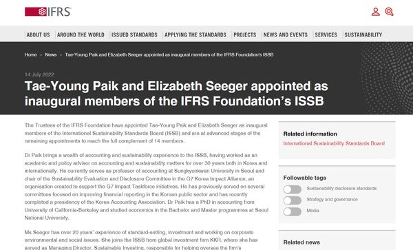 ISSB는 보도자료를 통해 “성균관대 백태영 교수와 KKR의 지속가능투자 책임자인 엘리자베스 시거(Elizabeth Seeger)가 ISSB 이사회 창립멤버로 공식 선정됐다”고 14일(현지시각) 밝혔다.