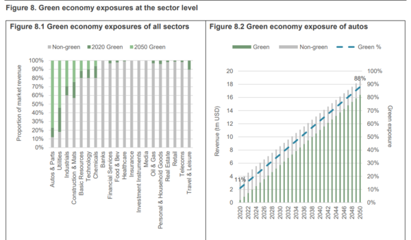 녹색 경제가 성장하면서, 녹색 경제 노출은 점진적으로 증가할 것으로 예상된다. FTSE는 연간 0.3%p 증가하여 2050년에는 25%에 도달할 것으로 봤다. 1.5°C 시나리오를 기준으로 하면 녹색 경제 노출은 더 가팔라진다. 1.5°C 시나리오에서 시장의 녹색 경제 노출은 2020년 6%에서 2030년 20%, 2050년 25%에 도달할 것으로 예상된다. 2030년까지 경제 노출도가 가파르게 증가하다 목표 도달 시점인 2050년엔 둔화하는 것이다.