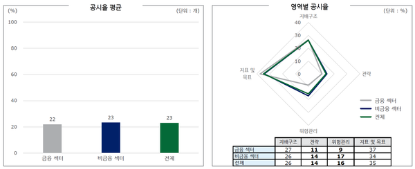 TCFD 4대 영역으로 분석한 결과, 금융 섹터와 비금융 섹터 모두 지배구조(금융 섹터 27%, 비금융 섹터 26%)와 지표와 목표(금융 섹터 37%, 비금융 섹터 34%)에서 높은 공시율을 나타냈다. 반면에 금융 섹터는 위험 관리 영역(9%)에서, 비금융 섹터는 전략 영역(14%)에서 가장 낮은 공시율을 보여 약점을 드러냈다.