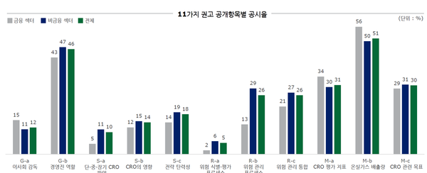 그 이외의 항목은 모두 낮은 공시율을 나타냈는데, 특히 금융 섹터와 비금융 섹터 모두, R-a(위험식별ᆞ평가프로세스) 항목에서 가장 낮은 공시율을 보였으며, G-a(이사회감독), S-a(단ᆞ중ᆞ장기별 기후관련 위험과 기회 파악) 항목과 S-b(기후관련 위험과 기회의 영향) 항목도 낮은 공시율을 나타냈다.
