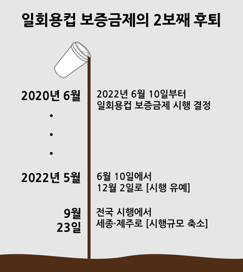 지난 6월부터 전국적으로 시행될 예정이었던 일회용컵 보증금제는 벌써 두 번씩이나 뒷걸음질만 치고 있다. 제도의 시행 시기가 6월에서 12월로 유예됐고, 지난 9월에는 시행규모가 전국에서 세종·제주로 축소됐다.