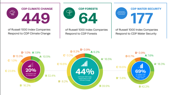러셀 1000 기업 중 CDP 기후 보고에 응답한 449개 기업은 B등급(32.4%)을 가장 많이 받았다. 가장 높은 등급인 A등급은 1.9%, 그 다음으로 높은 등급인 A-등급은 10.5%에 그쳤다. CDP 워터 시큐리티 보고에 응답한 177개 기업도 B등급(42.2%)을 가장 많이 부여받았고, CDP 포레스트 보고에 응답한 64개 기업 또한 B등급(39.9%)을 가장 많이 기록했다.
