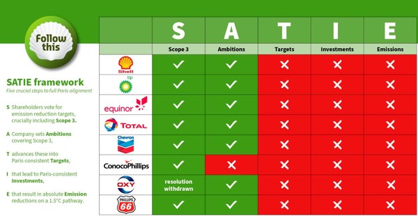 투자자 그룹 팔로우 디스(Follow This)는 쉘, BP, 엑손모빌, 쉐브론에 2030년 배출량 목표를 파리협정에 맞추도록 촉구하는 결의안을 제출했다. 팔로우 디스는 도합 1조3000억유로(약 1778조)의 자산을 보유한 투자자들이 모인 그룹으로, 세계 최대의 석유회사들에 온실가스 배출량을 빠르게 줄이라고 요구한 것이다.