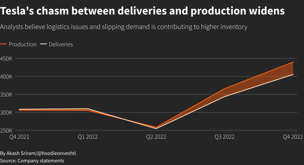 더 문제가 되는 것은 생산량 대비 인도량 부문이다. 올해 2분기부터 생산량 대비 인도량의 격차가 점점 커지는 모습이 보이면서 ‘테슬라 전기차에 대한 수요가 고점을 찍고 하향세에 들어선 것 아니냐’라는 우려가 커지고 있기 때문이다.