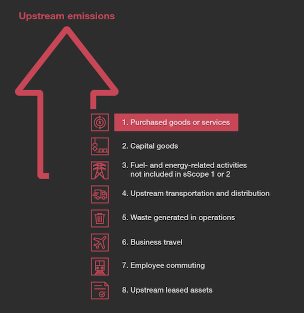 스코프 3는 15개의 범주에 걸쳐 형성되어 있다. 업스트림에는 원자재 및 구성 요소를 소싱, 생산 및 운송하는 과정에서 생성되는 배출이 포함된다. 그밖에 직원의 출퇴근뿐만 아니라 생성된 폐기물 및 임대 자산으로 인한 탄소 배출이 포함된다. 다운스트림에는 투자 및 프랜차이즈와 같은 활동에서 발생하는 배출량이 포함된다.