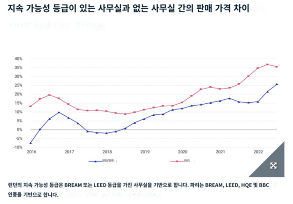 MSCI 데이터에 따르면, 지속가능한 사무실에 대한 수요가 증가하면서 가격 인상으로 이어지고 있는 것으로 나타났다. 영국의 친환경 건물 인증제인 BREEAM과 미국의 친환경 건물 인증제인 LEED에서 지속가능성 등급을 받은 빌딩과 그렇지 않은 빌딩 간 판매 가격 차이는 2022년 기준 26%에 달했다. 일종의 친환경 프리미엄이 붙는 셈이다.