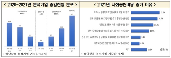 또한, 2021년 사회공헌 지출액이 전년 대비 증가한 기업은 50.5%로, 25%이상 증가한 기업도 전체 분석기업의 26.5%로 나타났다. 증가한 이유로는 ‘코로나 팬데믹으로 인한 사회적 지원 요구 증가’(22.1%) 및 ‘대표 사회공헌 프로그램에 대한 투자 증가 및 신규 론칭’(20.5%), ‘경영성과 호전에 따른 사회공헌예산 증가’(17.2%) 순이었다.