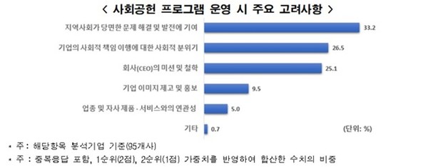 기업들은 사회공헌 프로그램을 운영할 때 가장 중요하게 고려하는 요소로 ‘지역사회가 당면한 문제 해결 및 지역 발전 기여’(33.2%)를 꼽았고, 이어 ‘기업의 사회적 책임 이행에 대한 사회적 분위기’(26.5%), ‘회사(CEO)의 미션 및 철학’(25.1%) 순으로 응답하였다.