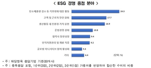 최근 확산되고 있는 ESG경영과 관련해 중점을 두고 있는 분야로는 ‘탄소배출량 감소 등 기후변화 대응’이 24.3%로 가장 많았고, 이어 고객 및 근로자 안전 강화(17.7%), 생산활동 내 친환경 가치 실현(16.9%)인 것으로 나타났다. 이는 글로벌 화두인 기후변화 대응에 대한 기업들의 동참 요구가 커지고, 최근 산업안전에 대한 관심과 사회적 요구 증가가 일부 반영된 것으로 풀이된다.