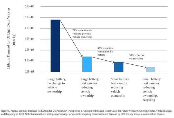 보고서는 "교통 시스템 내 승용차 비중을 줄이면서 EV 배터리 크기를 제한하면 리튬 수요를 적어도 18%에서 많게는 66%까지 줄일 수 있다"고 밝혔다. 한편 "승용차 비중을 그대로 두고 EV 배터리 크기만 제한하면 리튬 수요는 최대 42%까지 줄일 수 있다"고 덧붙였다.