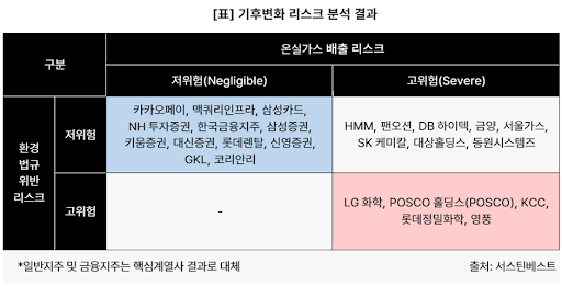 보고서는 LG화학, 포스코홀딩스, KCC, 롯데정밀화학, 영풍 5개 기업을 고위험군에 속한 기업으로 분류했다. 서스틴베스트는 해당 기업들이 기후변화의 전환 리스크가 매우 높으며, 향후 기후변화 관련 비용이 크게 증가할 것으로 예상된다고 밝혔다.